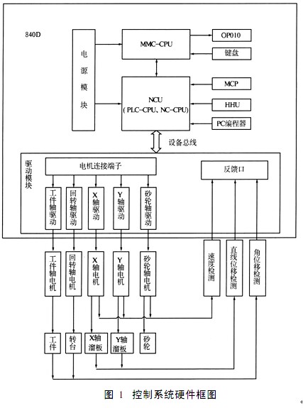 控制系統(tǒng)主要由 S I NUMER I K 840D數(shù)控系統(tǒng)、 伺服系統(tǒng)、 速度和位置檢測系統(tǒng)等組成. 系統(tǒng)原理框圖如圖 1所示.
