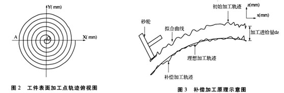 補償加工軌跡示意圖如圖 3所示.補償加工前,要根據(jù)砂輪的初始加工軌跡,擬合出一條連續(xù)的誤差曲線, 擬合曲線與理想軌跡(由非球面公式計算得到)之差就是補償加工的進給量.