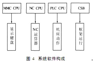 MMC-CPU基于人機界面設(shè)計,負責(zé)輸入、 顯示輸出等,系統(tǒng)軟件為W i ndow s操作系統(tǒng),便于與外部軟硬件的接口,統(tǒng)一的通訊協(xié)議,并可以擔(dān)當(dāng)復(fù)雜數(shù)學(xué)運算, 提供良好其他高級編程語言的平臺. NC-CPU基于數(shù)控運算控制. PLC-CP U由西門子可編程器 S tep7設(shè)計,負責(zé)機床運動控制, 主要參與邏輯開關(guān)量的控制,完成機床的輔助協(xié)調(diào)控制. CSB-CPU基于多 CP U并行運行的控制理念,負責(zé) CP U之間的協(xié)調(diào)工作.