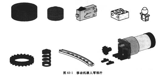 移動(dòng)機(jī)器人模型組合包由各種連桿、直齒輪、錐齒輪、齒輪軸、蝸輪蝸桿、凸輪、絲杠螺母、萬(wàn)向節(jié)、齒輪箱、鉸鏈、按鈕開(kāi)關(guān)、車輪、電動(dòng)機(jī)、光電開(kāi)關(guān)和按鈕開(kāi)關(guān)等組成,見(jiàn)圖6 2-1。該模型組合包采用積木式插裝結(jié)構(gòu),連接簡(jiǎn)單方便,尺寸精確,采用這些構(gòu)件進(jìn)行組合和設(shè)計(jì),結(jié)合電氣控制元件可以得到各種不同的移動(dòng)機(jī)器人模型。