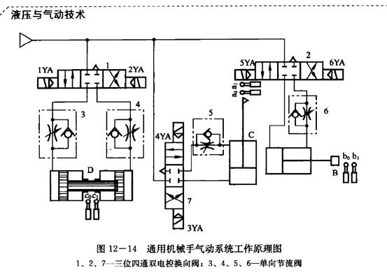圖12-14為一種通用機械手的氣動系統工作原理圖(手指部分為真空吸頭,即無A氣缸部分),要求其工作循環為:立柱上升戶伸臂~立柱順時針轉~真空吸頭取工件~立柱逆時針轉~縮臂~立柱下降。