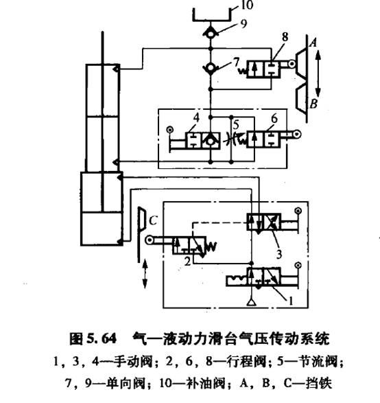 氣一液動力滑臺是采用氣一液阻尼缸作為執(zhí)行元件,在機械設(shè)備中用來實現(xiàn)工作滑臺的進給運動,圖5. 64為氣液動力滑臺氣壓傳動系統(tǒng)的原理圖。該氣一液動力滑臺能完成兩種工作循環(huán)。