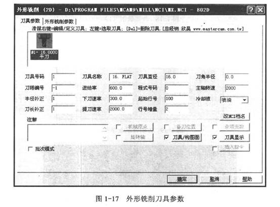 2)將鼠標(biāo)移動(dòng)到“D16",單擊鼠標(biāo)右鍵選擇“刀具路徑”“外形銑削”,在主菜單區(qū)選擇“串聯(lián)”,選擇矩形(高亮顯示),單擊“執(zhí)行”,選擇直徑為16mm的平刀,輸入進(jìn)給率:600.0、下刀速率:300.0、提刀速率:zooo.o、主軸轉(zhuǎn)速:2000,冷卻液:噴油,如圖1-17所示。