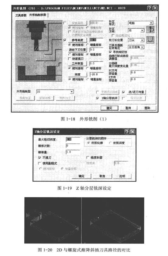通過(guò)2D和螺旋式漸降斜插刀具路徑的對(duì)比(圖1-20)可以發(fā)現(xiàn),螺旋式漸降斜插進(jìn)給路徑較短,因而加工效率要高一些。實(shí)際加工時(shí),應(yīng)根據(jù)具體情況靈活選用。外形銑削中還有一種較為特殊的平面多次銑削方式,既可以當(dāng)做面銑加工,也可以當(dāng)做挖槽加工,將在后續(xù)例子中講述。