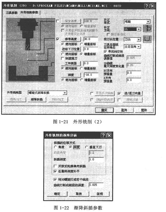 1) 單擊“漸降斜插”,斜插的位移方式有角度、深度和垂直下刀,這里選擇“深度”方式,勾選“在最終深度補(bǔ)平”,斜插深度:1.0,其余默認(rèn),如圖1-22所示。