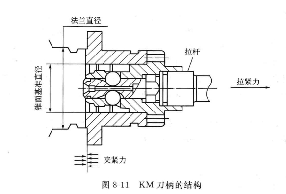 KM刀柄是1987年美國K。nnam碘a1公司與德國w汕a公司聯(lián)合研發(fā)的l,lo短錐空心刀柄(圖8—11),其長度僅為規(guī)范7:24錐柄長度的1/3。因為合作錐度比較短,且刀柄規(guī)劃成中空布局,在拉桿抽向拉力的效果下,短錐可徑向縮短,所以有效地處理了端面與錐面向時定位而發(fā)作的干與疑問。與HsK的首要區(qū)別是夾緊組織不一樣,它由鎖閉桿波動輪和鋼球組成,夾緊時用鎖閉桿牽引,靠其斜面沿半徑向外推鋼球,使之與刀柄的歪斜孔相觸摸,
