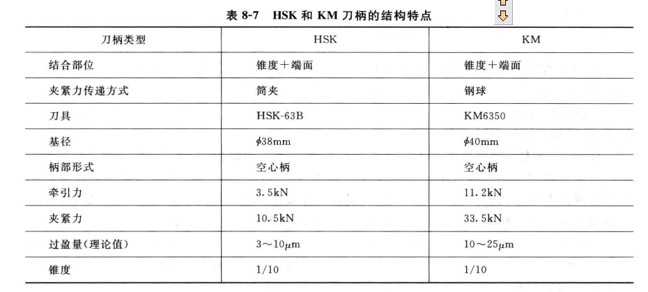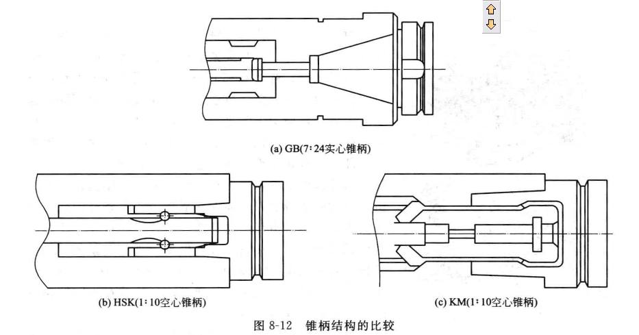 o.o01一o.o025mm),具有適應(yīng)高速旋轉(zhuǎn)和換刀時間短以及固定與旋轉(zhuǎn)刀具通用等長處,為刀具進步切削功率和加工質(zhì)量,減少磨損及破損創(chuàng)造了條件。因而,此類刀柄特別合適高速切削加工。德國已將HSK刀柄正式歸入DIN69893標ZB,并取得Iso/TC29專業(yè)委員會的認可。HsK與KM作為機床刀具接口或作為刀具體系模塊的銜接辦法,是機械加工向高速切削范疇開展不行短少的一套配置體系。表8—7列出了HsK和KM刀柄的布局特色,三種刀柄的布局比較見團8—12。