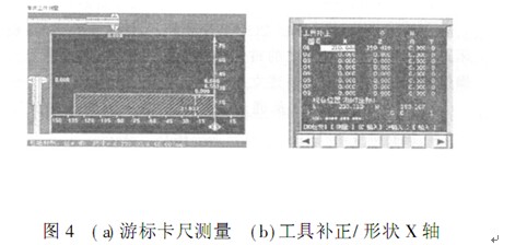 ( 4)用手輪方式將 01 號外圓車刀試車工件外圓一段(這一段不必太長也不必太深, 長度只要能放上游標(biāo)卡尺或千分尺就可以,深度要保證不影響整個零件前段尺寸的加工) , 將刀具沿+ Z 軸移出, 此時 X 軸不能移動,停主軸用游標(biāo)卡尺或千分尺測量剛被車過的地方,圖 4( a)游標(biāo)卡尺測量,如圖 2已車表面, 點(diǎn)擊 MDI鍵盤上的 offset setti ng 鍵, 進(jìn)入刀具補(bǔ)償界面,按 CRT 顯示器軟鍵所對應(yīng)的形狀, 在 01 號刀 X 軸中輸入測量得來的數(shù)值,如圖 4( b) 所示,點(diǎn)擊控制面板上的/ 刀具測量0 ,再點(diǎn)擊軟鍵對應(yīng)的/ 測量0 , 01 號刀具 X 軸對刀完成, 即1 號刀具 X 軸工件坐標(biāo)系建立, 此時 X 軸可隨意移動。