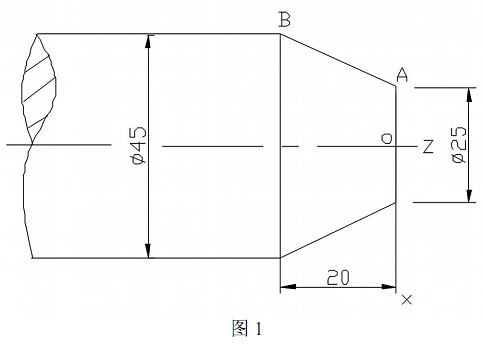 直線插補(G01) : G01X__Z__F__刀具以指令的進給速度移至坐標值為X、 Z的點上。 例如, 如圖1 所示G01X45Z-20F30(A—B) :